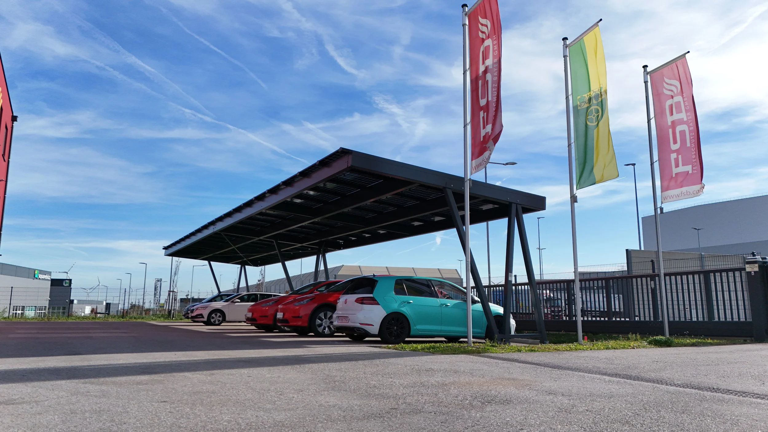In Großebersdorf errichtete die Austroport Carport GmbH ein innovatives Solar-Carport in elegantem Schwarz mit hochwertigen Glas/Glas-Photovoltaikmodulen. Die Anlage wurde für den Parkplatz der Firma FSB Feuerschutz Bayer konzipiert und verbindet modernes Design mit effizienter Energiegewinnung direkt am Standort.